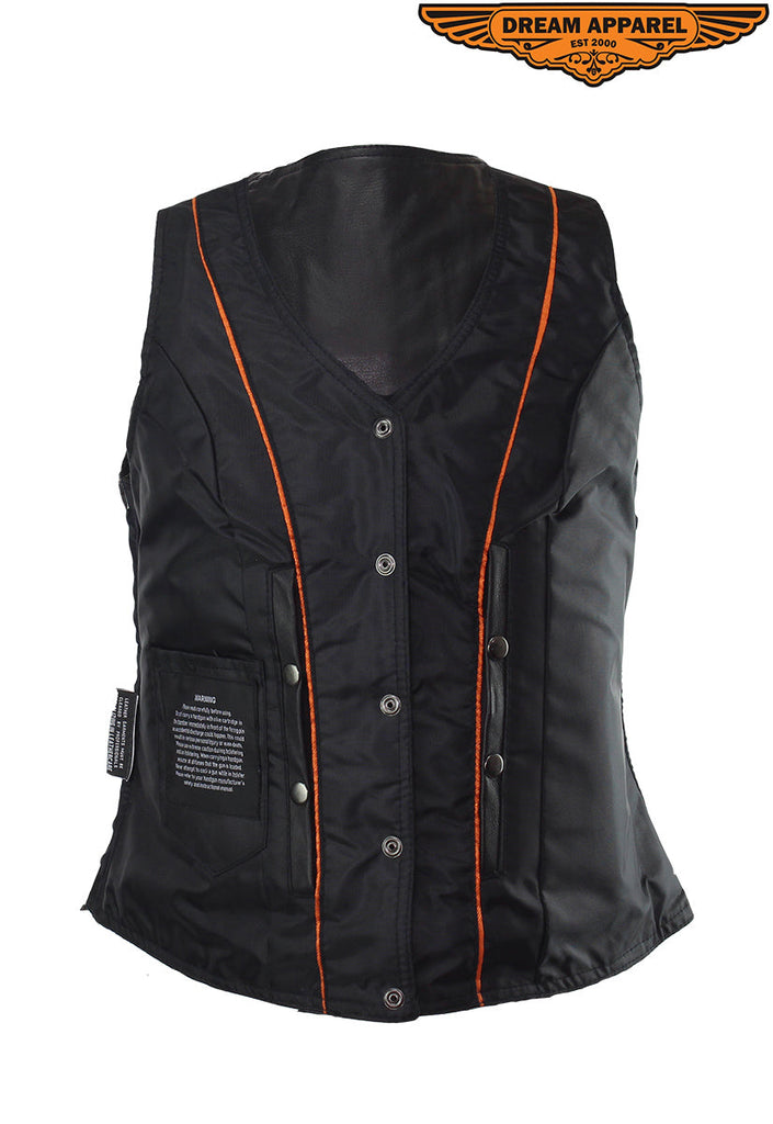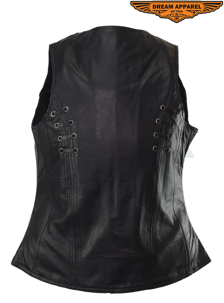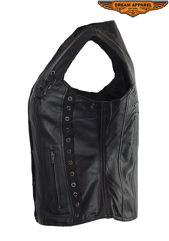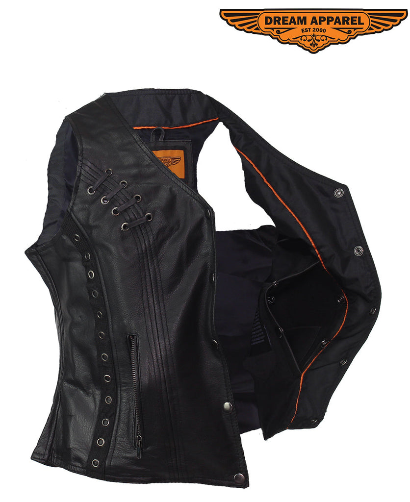 This soft, lightweight vest was built with every day comfort in mind while still making sure we put you in the most stylish fit possible. The high quality naked cowhide leather is soft and durable. Truly a beautiful option for all of the ladies. Protection is never a negative and this which is why we implemented two dual-snap deep concealed pockets. Both conceal carry pockets have an elastic strap within them, allowing you to secure the barrel. Speaking of pockets, there are several more which give this vest an array of storage options. The two zippered waist pockets are mid-sized and great for keys and other every day items. Another slip pocket can be found on the inner left side. The lining on the jacket is orange. The front closure is snapped giving off a simple yet appealing look. The vest itself has a very unique look and was designed with detail. Both the left and right front side, strap runs down with beautiful eyelets along each. Along with this, more eyelets can be found as they are placed on the front and back of the vest with a leather piece going through each. These features give off a unique look allowing you to stand out amongst your peers. Grab yours now, do not miss out on this amazing option.