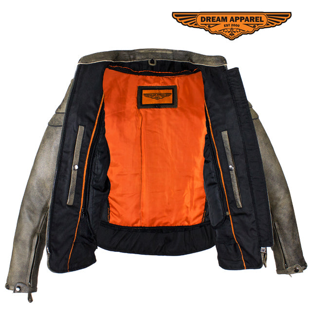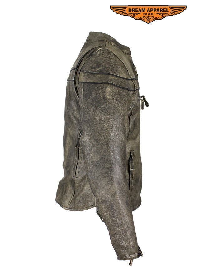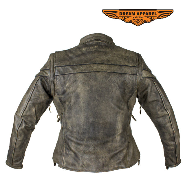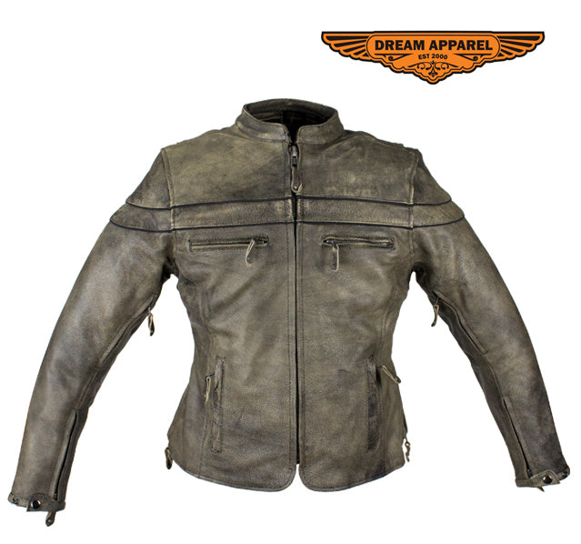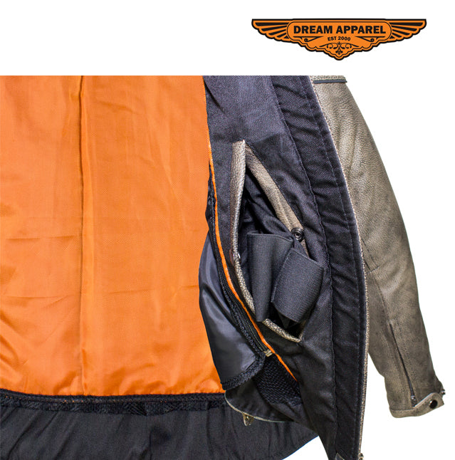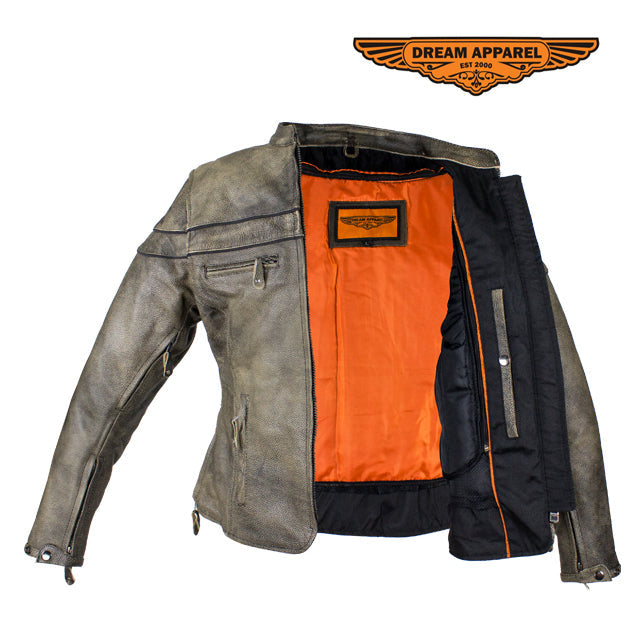 Ladies, treat yourself for a change. Dream Apparel has designed this incredible jacket with two large concealed carry pockets inside with button-snaps and two rows of reflective piping that run across the front, shoulders, and back. Your comfort's assured by a racing style collar, a zippered front closure, zippered cuffs with button snaps, and zippered sides for a perfect fit. Ride throughout the year with a full lining that runs through the sleeves for cooler weather or two zippered air-vents on the front and back and grommets and vents under each arm for warmer. The two zippered waist pockets on front give you plenty of room making this an incredible jacket at an unbelievable price.