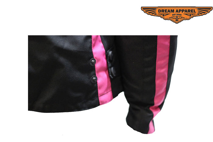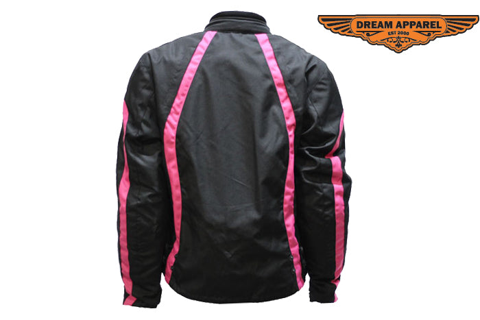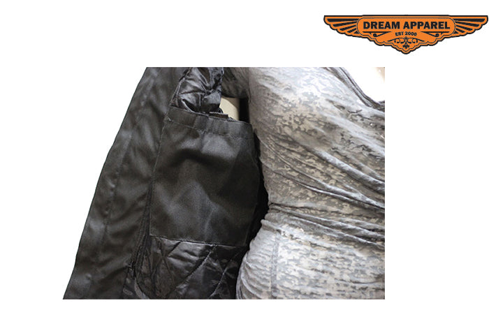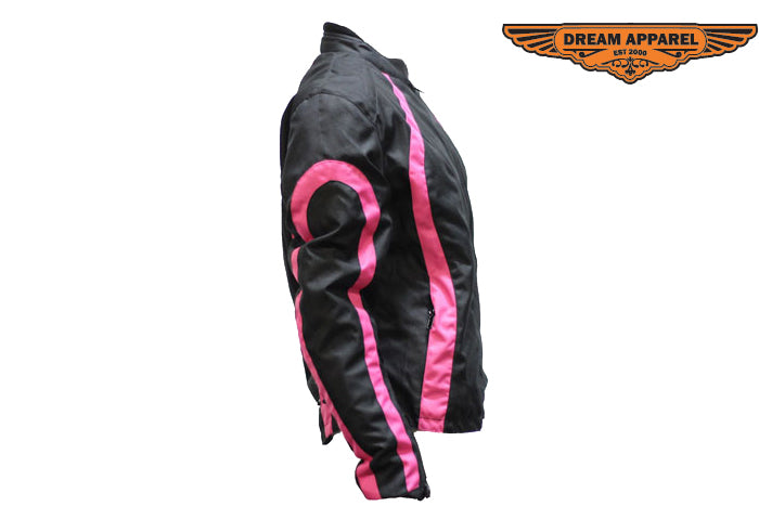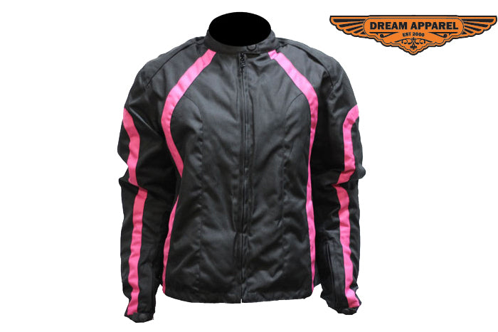 Great women's racer jacket made from extremely durable textile with removable padding on the shoulders, elbows, and back. Jacket also includes 2 airvents, multiple pockets, and zippered cuffs for a great fitting.