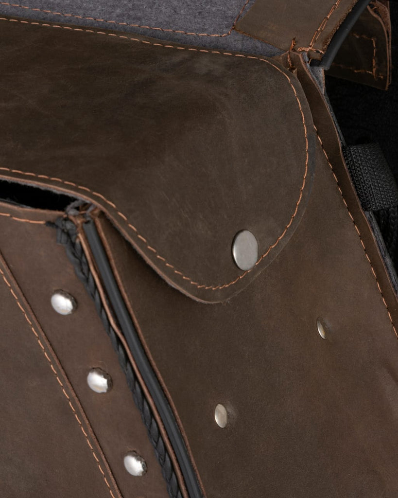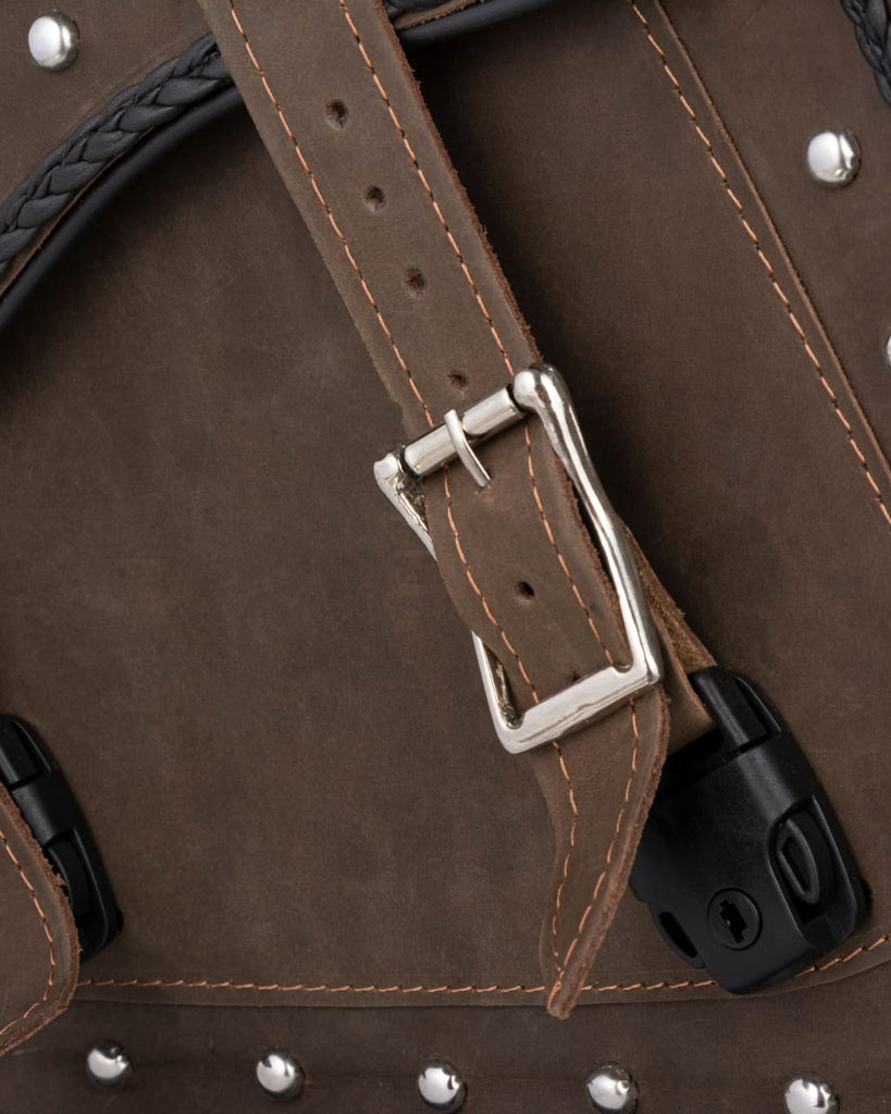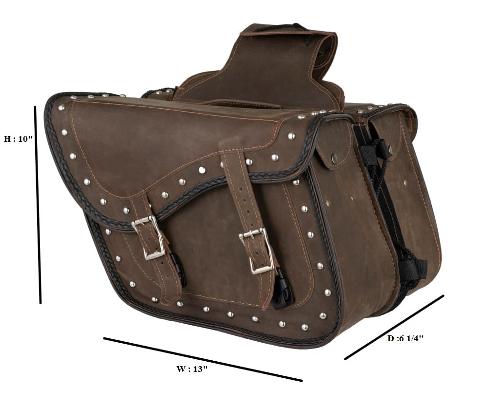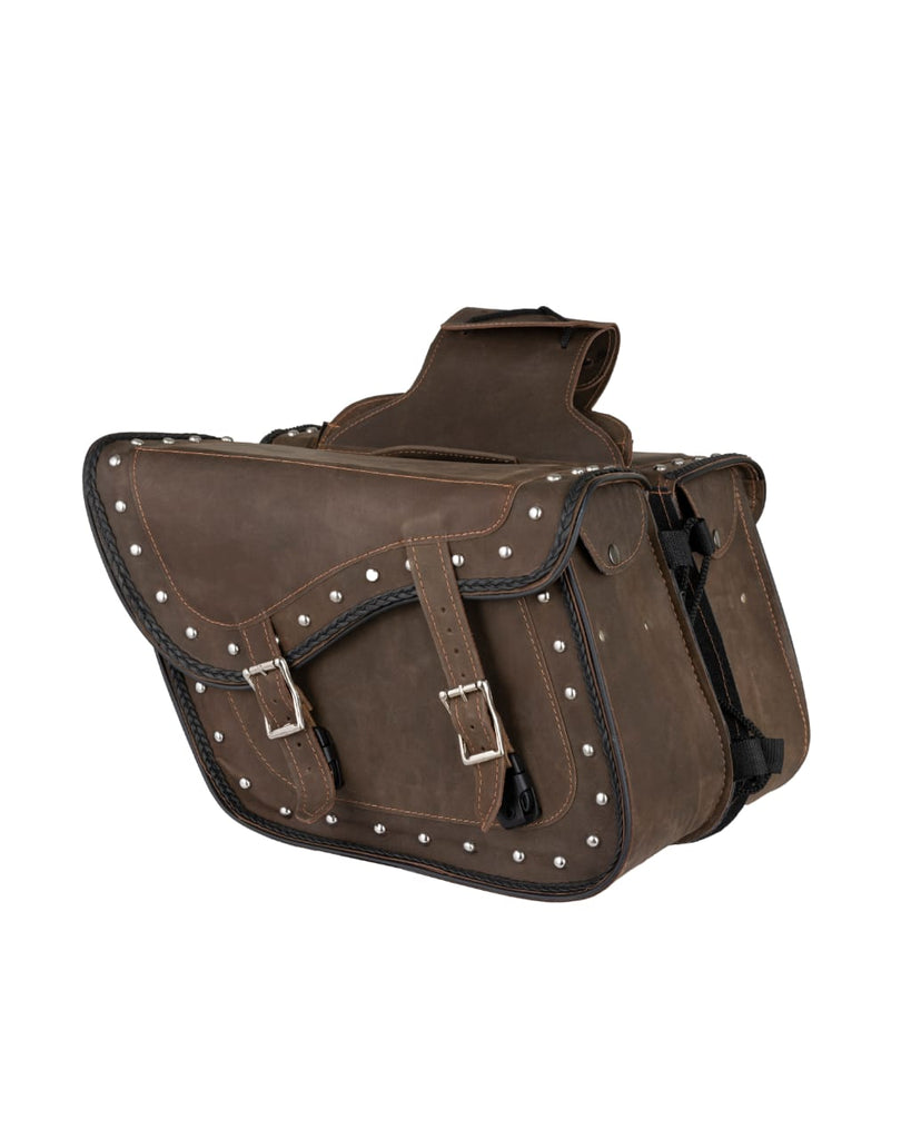 If you're looking to increase your cruising distance, then a bigger bike isn't the only thing you'll need. This 13" x 10" x 6.25" vintage brown color, waterproof, naked cowhide leather is sewn around a hard shell and features elastic and adjustable strapping in each bag to secure your handguns, is water proof, guaranteed to hold its shape, and fits any motorcycle. Inside each bag is a nylon side pocket with an elastic band for smaller items. Everything is safe and secure by protective flaps over the openings with button snaps. The whole bag closes with an outer flap with heavy-duty quick release clips styled to look like vintage chrome roller buckles. Thin black braiding along the edges and chrome studs run along the braiding to provide a fantastic look. The bags tie together with flaps that go over the fender and tie together by nylon laces. For added support, they zip to the flaps by adjustable covered zippers and come with four tie down laces. Each bag comes with a strong carrying handle, a protective strip underneath them to protect them from road hazards, and heat protection on the sides. Order yours today as these incredible saddlebags offer an amazing value and are priced to move.