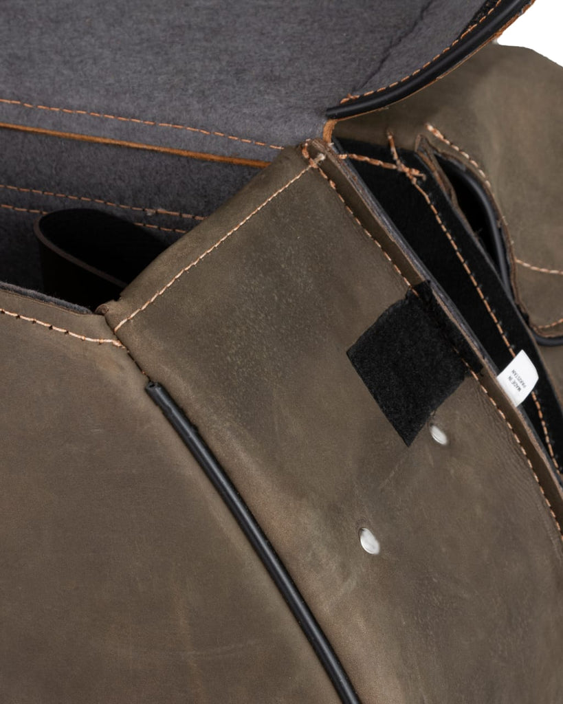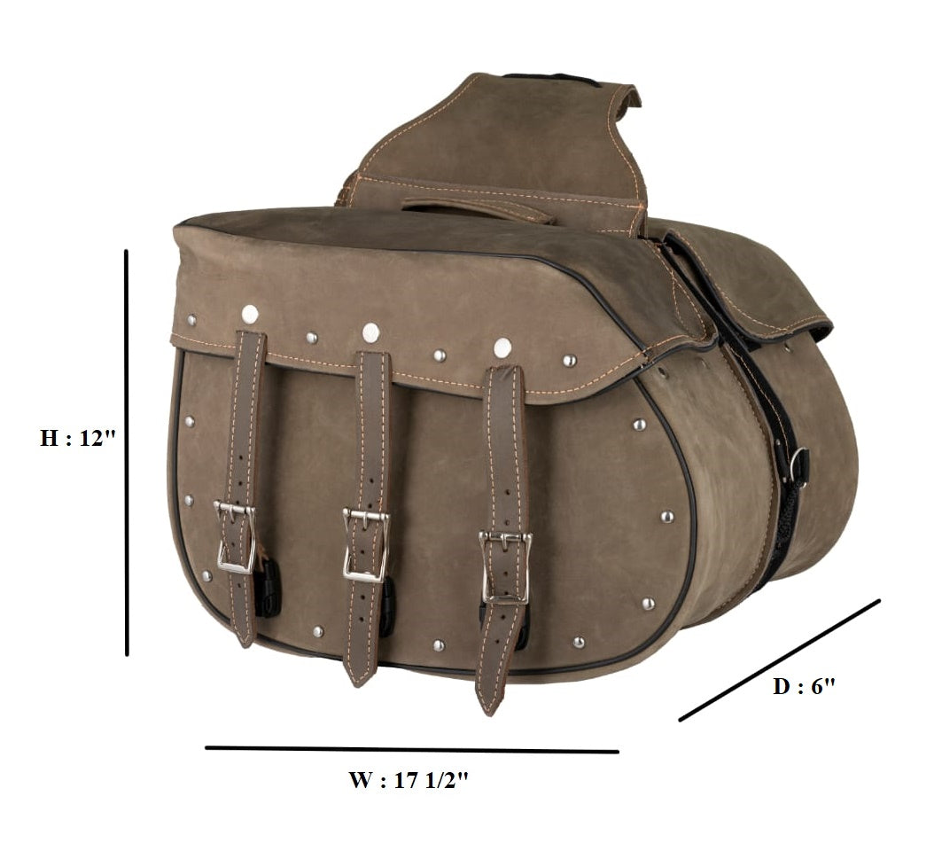If you're looking to increase your cruising distance, then a bigger bike isn't the only thing you'll need. This 17.5"W x 6"D x 12"H vintage brown color, waterproof, naked cowhide leather is sewn around a hard shell and features elastic and adjustable strapping in each bag to secure your handguns, is water proof, guaranteed to hold its shape, and fits most motorcycles, Inside each bag is a nylon side pocket with an elastic band for smaller items. Everything is safe and secure by protective flaps over the openings with button snaps. The whole bag closes with an outer flap with heavy-duty quick release clips styled to look like vintage chrome roller buckles. Thin black braiding along the edges and chrome studs run along the braiding to provide a fantastic look. The bags tie together with flaps that go over the fender and tie together by nylon laces. For added support, they zip to the flaps by adjustable covered zippers and come with four tie down laces. Each bag comes with a strong carrying handle, is heat protected & road hazards protection. Order yours today as these incredible saddlebags offer an amazing value and are priced to move.